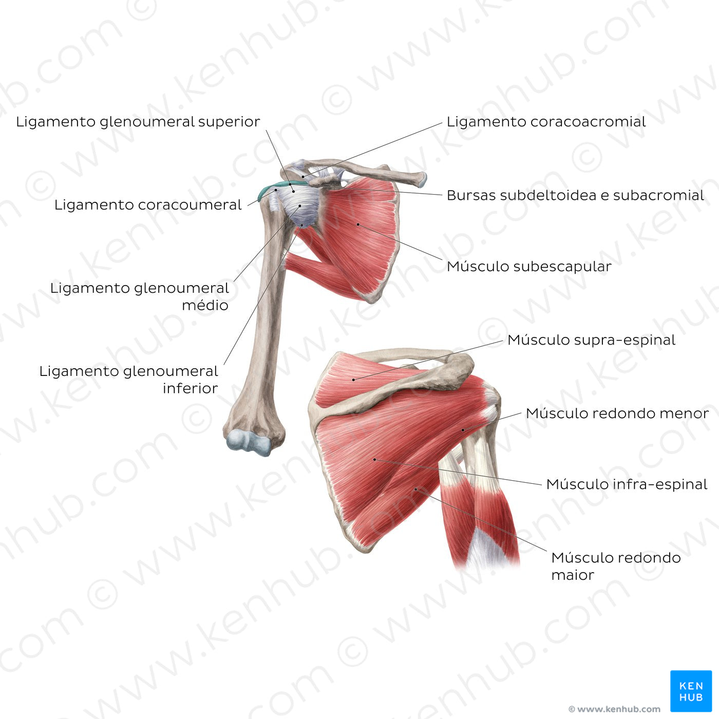 Os três ligamentos glenoumerais (superior, médio e inferior) são formados por espessamentos da cápsula articular, e conectam a cabeça do úmero à cavidade glenoide da escápula. O ligamento coracoumeral conecta o processo coracoide da escápula ao tubérculo maior do úmero, e reforça a porção superior da cápsula articular glenoumeral. O ligamento transverso do úmero se estende entre os tubérculos maior e menor do osso, e estabiliza o tendão da cabeça longa do músculo bíceps braquial. Por fim, a articulação também é estabilizada por quatro músculos (supra-espinal, infra-espinal, redondo menor e subescapular) conhecidos, em conjunto, como manguito rotador, que forma a bainha musculotendínea ao redor da articulação.