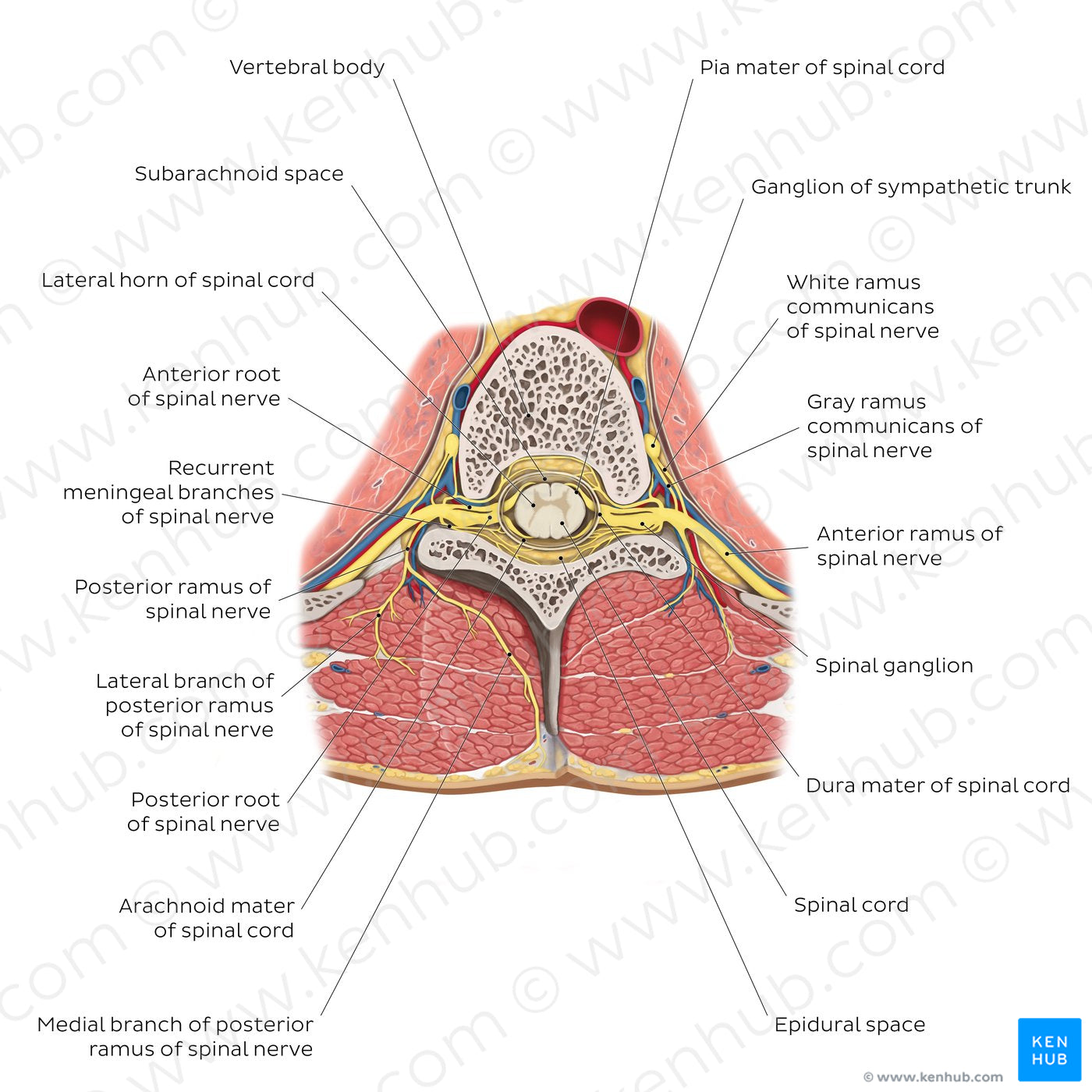 On exiting the intervertebral foramen, each spinal nerve divides into anterior and posterior rami. The posterior ramus extends in a posterior direction and further divides into medial and lateral branches, which provide innervation to the deep back muscles (epaxial muscles) as well as an associated narrow strip of overlying skin. The anterior ramus provides motor innervation (somatic or visceral) to the rest of the body related to that segmental level, often intermingling with other spinal nerves leading to the formation of the major somatic plexuses (cervical, brachial, lumbar and sacral). Just before the bifurcation into anterior and posterior rami, the spinal nerve also gives rise to one or more recurrent /meningeal branches which re-enter the intervertebral foramen to supply the meninges and other structures of the vertebral canal. Communicating with the anterior ramus of the spinal nerves are the white and gray rami communicantes which convey sympathetic nerve fibers. The anterior rami of spinal nerves T1-L2 give off the white ramus communicans which carries preganglionic sympathetic fibers from the lateral horn of the spinal cord to an adjacent sympathetic ganglion. Here they can either synapse with a postganglionic sympathetic neuron at the same or a superior/inferior level via the sympathetic trunk, or pass through the sympathetic ganglion (without synapsing) continuing as a preganglionic nerve fiber; in all cases nerve fibers of the sympathetic trunk reenter the spinal nerves via a gray ramus communicans.