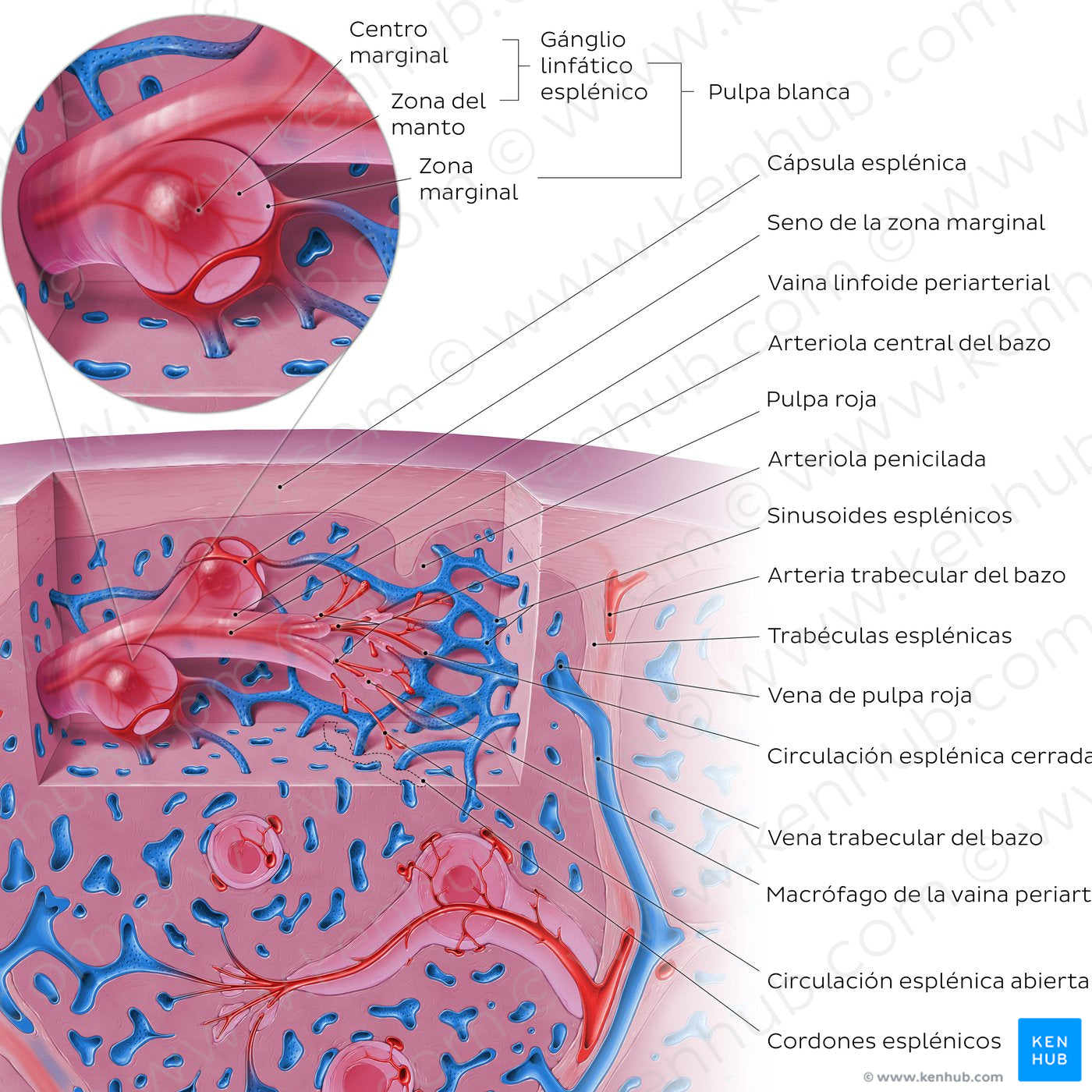 El bazo está rodeado por una cápsula fibroelástica, siendo el lugar donde se extienden las trabéculas que dividen el parénquima en secciones. La mayoría del parénquima está formado por la pulpa roja que está organizada en cordones esplénicos (de Billroth), estos se encuentran separados por sinusoides esplénicos donde la sangre es filtrada para la eliminación de células rojas defectuosas y detritos celulares. La pulpa blanca está compuesta por formaciones de tejido linfático alrededor de una arteriola central y consiste en tres compartimientos: la zona marginal, las vainas linfoides periarteriales (PALS por sus siglas en inglés), y los nódulos linfoides. En la circulación abierta del bazo, la sangre es llevada dentro de los cordones esplénicos a través de las arteriolas peniciladas donde se filtra mientras pasa por los sinusoides esplénicos, mientras que en la circulación cerrada los capilares desembocan directamente en los sinusoides
