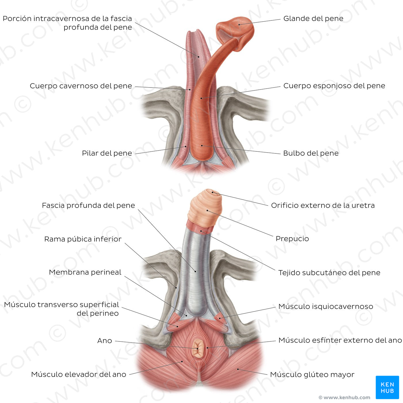 La raíz del pene constituye la porción fija del pene, mientras que el cuerpo forma la porción libre del mismo. El bulbo del pene consiste en la porción proximal del cuerpo esponjoso y se encuentra firmemente anclado a la membrana/cuerpo perineal, mientras que los pilares del pene están fijados a las ramas isquiopubianas de la cintura pélvica. El pene está estabilizado aún más por el ligamento suspensorio y el ligamento fundiforme (el cual no se observa en esta ilustración. Alrededor del bulbo y los pilares del pene, se encuentran los músculos bulboesponjoso (ausente en la imagen) e isquiocavernoso. Dichos músculos ayudan a vaciar la uretra y a estabilizar al pene cuando se encuentra erecto. Así mismo, pero esta vez alrededor de la estructura del pene y los tejidos eréctiles, se encuentra la fascia profunda y superficial/tejido subcutáneo del pene. La fascia profunda rodea los tres tejidos eréctiles y se encuentra superficial a la túnica albugínea del pene. Tal como lo dice su nombre, la fascia superficial se ubica en la porción superficial y es continua con la fascia superficial/tejido subcutáneo del perineo (fascia de Colles).