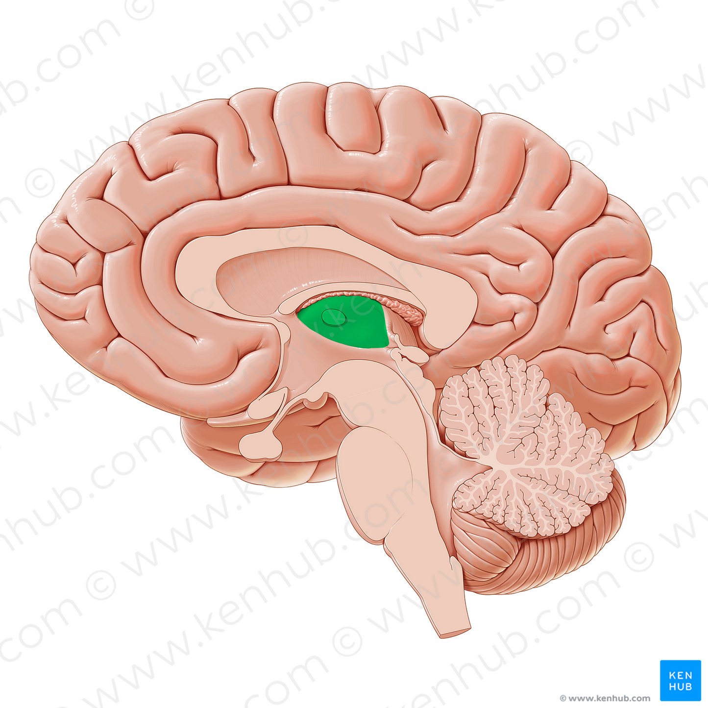 Shown from medial perspective. Also known as Dorsal thalamus, and Thalamencephalon.