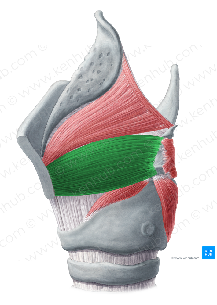 Shown from lateral left perspective. Also known as External part of thyroarytenoid muscle, and Lateral part of thyroarytenoid muscle.