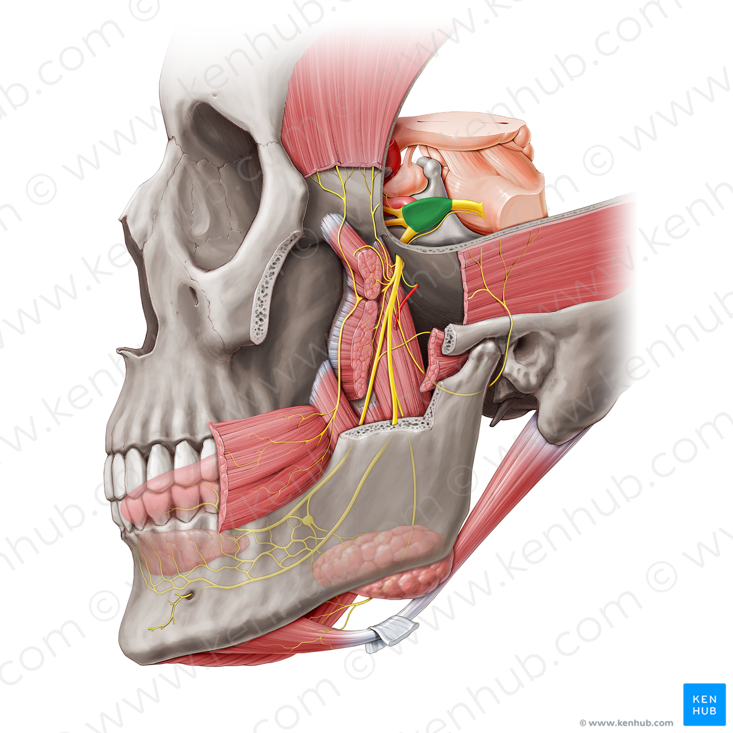 Shown from lateral left perspective. Also known as Gasserian ganglion, Semilunar ganglion, and Gasser's ganglion.