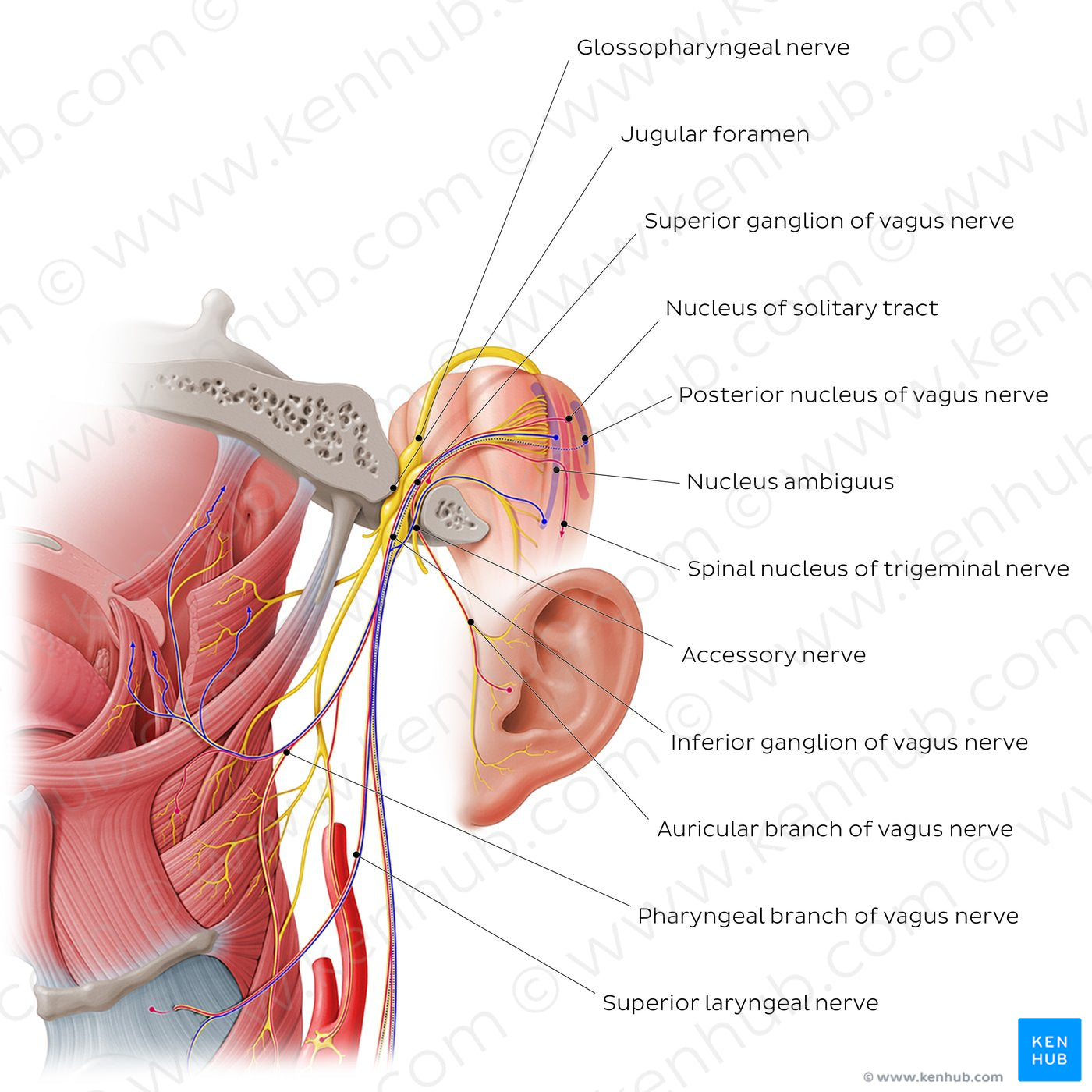 The vagus nerve carries special visceral efferent/branchiomotor fibers from the nucleus ambiguus and general visceral efferent/parasympathetic fibers from the posterior(dorsal) nucleus of vagus nerve. General somatic afferent/sensory fibers are carried to the spinal nucleus of trigeminal nerve, while both general and special visceral afferent fibers arrive at the nucleus of solitary tract. The vagus nerve emerges from the lateral surface of the medulla oblongata (retroolivary groove) as a group of rootlets that merge before exiting the skull via the jugular foramen between the glossopharyngeal (CN IX) and accessory (CN XI) nerves. In this region, the vagus nerve bears the superior (jugular) ganglion (of vagus nerve) that contains the cell bodies of GSA fibers and has connections to the glossopharyngeal nerve, cervical sympathetic trunk and cranial root of accessory nerve (which is nowadays considered as a functional component of the vagus nerve). The superior ganglion gives off a meningeal branch (not shown) as well as an auricular branch, which supplies parts of the auricle and tympanic membrane. Below the superior ganglion is the inferior (nodose) ganglion which contains cell bodies of visceral and special sensory fibers of the vagus nerve and has connections with the hypoglossal nerve (CN XII). After exiting the jugular foramen, the vagus nerve gives off a pharyngeal branch which supplies motor function to pharyngeal constrictor and palatine muscles, as well as receiving some GVA/sensory fibers from the pharyngeal plexus also. It also communicates with the carotid sinus nerve (of glossopharyngeal nerve). The final upper cervical branch seen here is the superior laryngeal nerve.