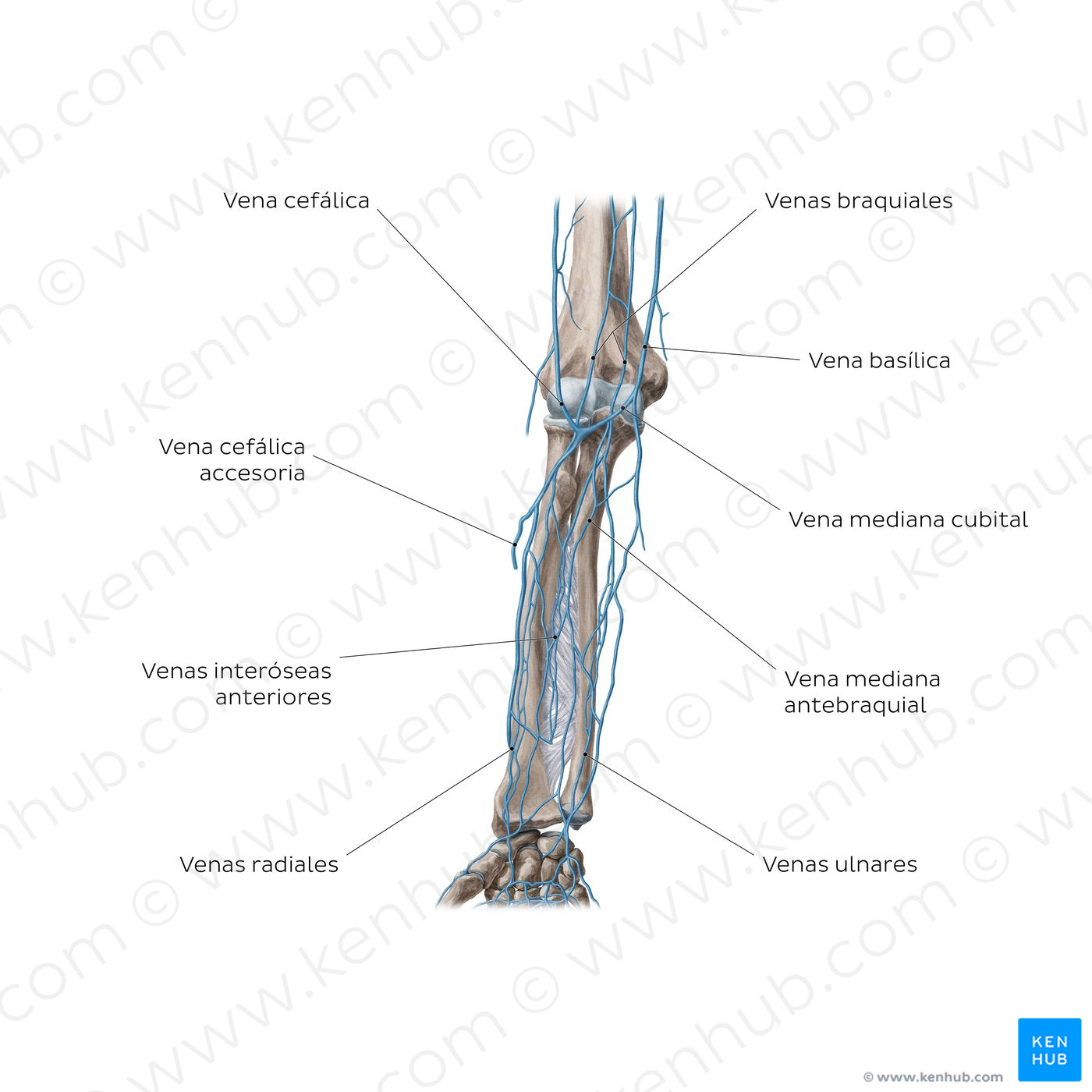 El miembro superior es drenado por los sistemas venosos profundo y superficial. Las principales venas superficiales incluyen a las venas cefálica y basílica que emergen desde la red venosa dorsal. La vena cefálica se comunica con la vena basílica por medio de la vena mediana cubital y drena las regiones superficiales de la mano, muñeca y antebrazo. La vena mediana antebraquial drena la región anterior del antebrazo, desembocando generalmente en la vena mediana cubital/basílica en la región de la fosa cubital. El sistema venoso profundo surge del arco venoso palmar y está formado por las venas pareadas radial, ulnar e interósea anterior que desembocan en las venas braquiales del brazo. Las venas profundas del antebrazo se comunican con las venas superficiales por medio de las venas perforantes.