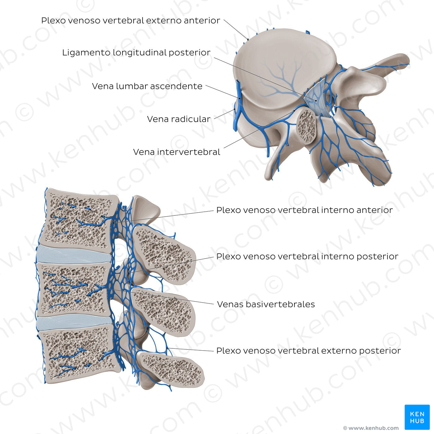 Las venas espinales forman los plexos venosos vertebrales interno y externo a lo largo de la columna vertebral. Cada uno de estos plexos puede ser dividido en anterior y posterior. Dentro del hueso trabecular del cuerpo vertebral se encuentran las venas basivertebrales. Estas venas emergen en el aspecto posterior de cada cuerpo vertebral y drenan en el plexo venoso vertebral externo anterior y el plexo venoso vertebral interno anterior. Las venas intervertebrales se ubican en la cara superior del pedículo del arco vertebral de cada vértebra y drenan las regiones de la médula espinal y plexos vertebrales. Las venas intervertebrales viajan a través de los forámenes intervertebrales de la columna vertebral para drenar en la vena vertebrales del cuello y venas segmentales del tronco.